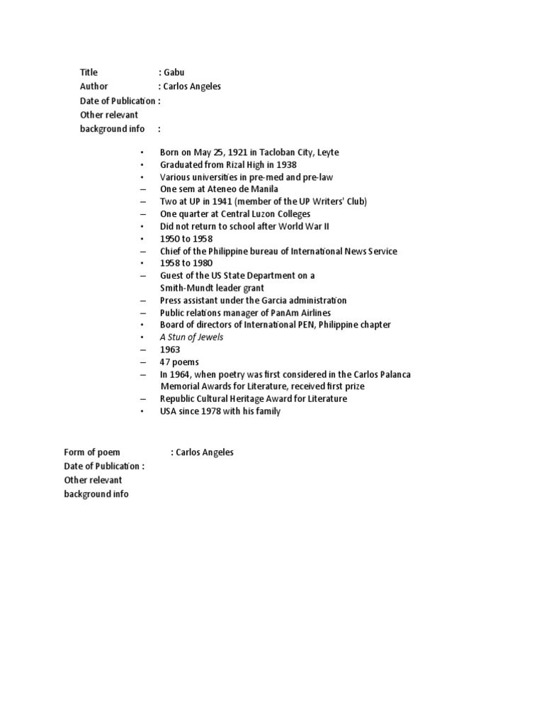Analysis angeles carlos poem essays gabu. Gabu by carlos angeles the waste of centuries is grey and dead. It is the sea pursues a habit. Havocs the wasteland hard within its reach. Angeles was born in tacloban city, leyte on may 25, 1921.